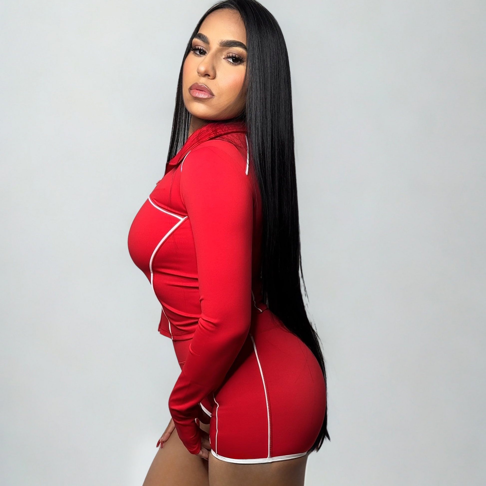 Este conjunto está disponible en un intenso rojo con ribetes blancos y en un clásico blanco con ribetes negros, ambos confeccionados en una tela lisa que combina comodidad y un acabado impecable. El "Elegance Glow Set" es la pieza perfecta para brillar en el gimnasio o en la calle.